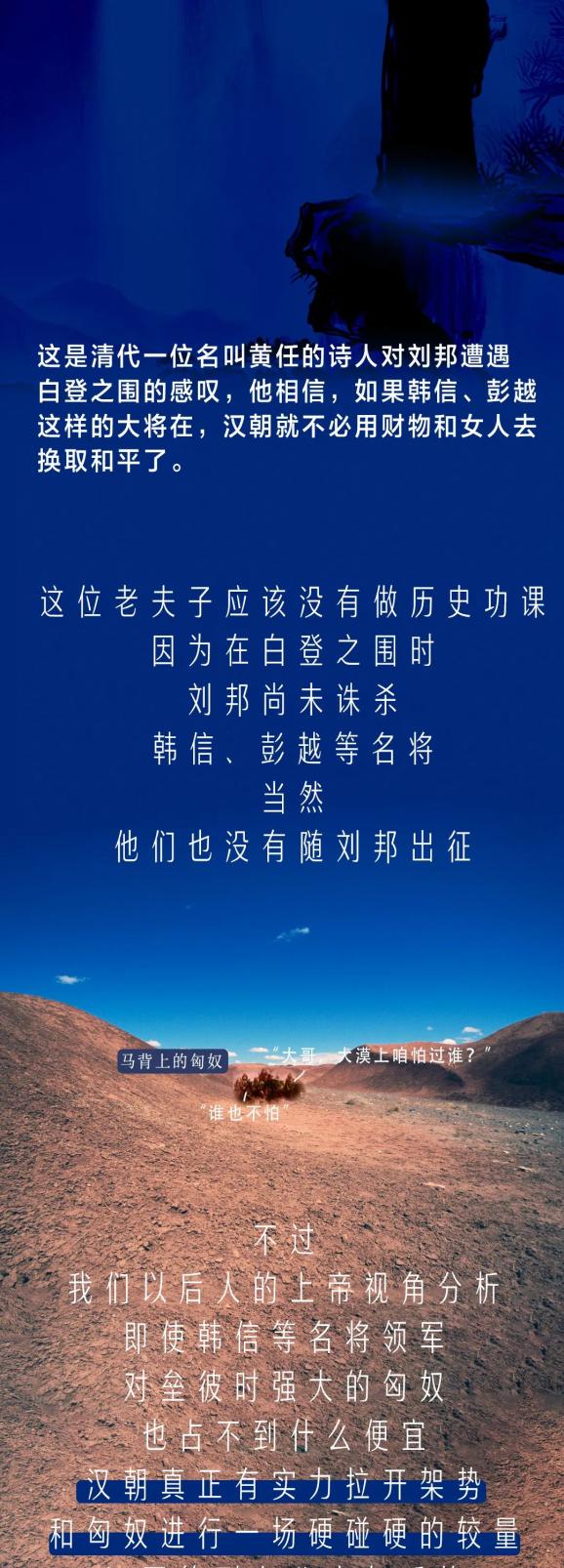 局势很明了,双方都想赶紧结束这场无聊的比赛,因此,汉军突围成功更像是刘邦和冒顿的一种心理默契。但这一仗确实让刘邦见识到了匈奴的力量,为了确保边境的安稳,暂时只能采取守势,以金钱赎买和平是最现实的策略。