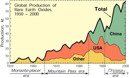 美国曾经是全球稀土产量最大的国家,大概从图中第二根虚线部分,也就是1984年起,突然被“毫无姓名”的中国迅速超越。