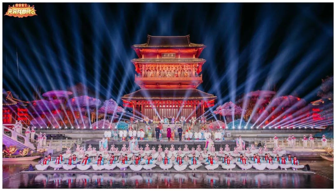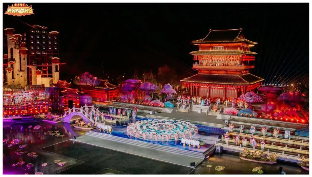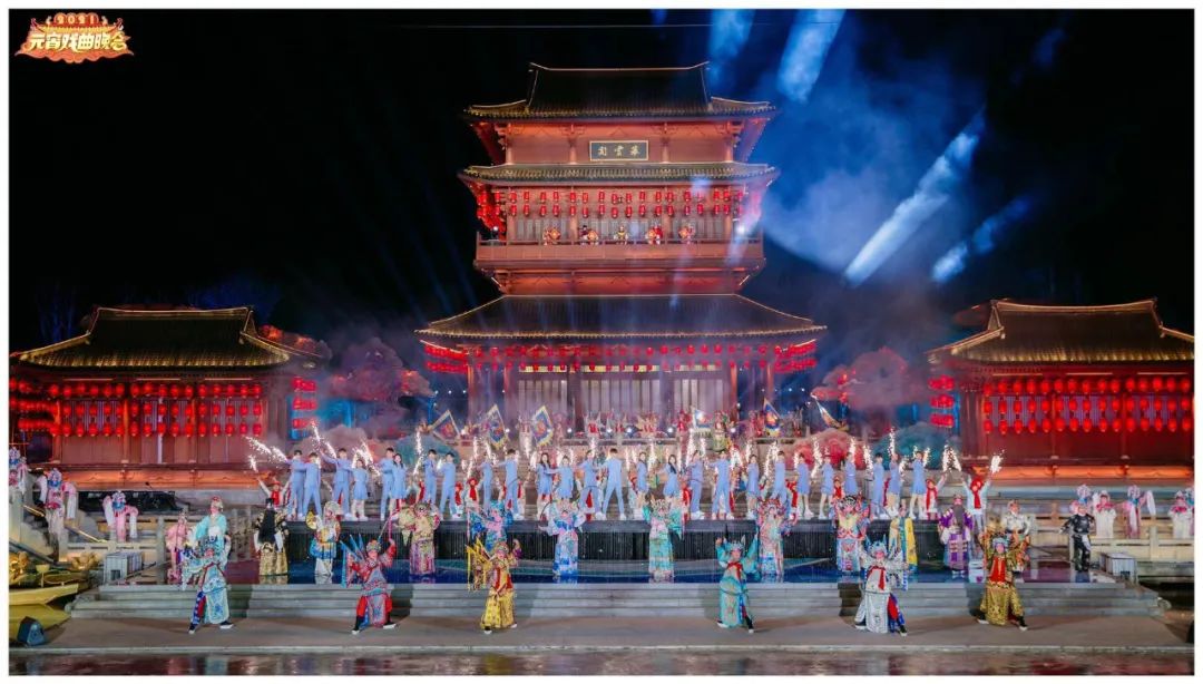 《2021元宵戏曲晚会》将户外实景和情境融合,设计时长100分钟,共分为9个篇章,高科技的手段更是为晚会增加了时尚感和浸入式体验。晚会的执行导演潘宁透露,整台晚会的开场大秀“山河百景”,恢弘而喜庆,层次感丰富,让观众有一种“穿越”之感,外围的舞龙舞狮和民俗表演,汉潮街上身穿汉服的‘古人’与现代人同时游走,以及“斯坦尼康”一镜到底的拍摄方式,让人们身临其境,再现了“上元之夜”的灯影月色、市集喧闹、游人如织的盛况。而在街巷之中,又有杂耍、功夫茶、当地美食的展示,汉朝街内的小舞台上有水袖 、椅子功等戏曲元素的呈现。而随着冲天响的烟花,人们的视线来到了主舞台,用AR技术将戏曲演员和舞蹈演员组成的场面从圆月中引出,开启了好戏连台。借助于景区内的威亚索道,使得灯笼和丝带高悬,亭台楼阁交相辉映,主舞台变成青绿山水中的月中仙阁,一轮满月悬挂半空,古朴卷轴徐徐展开,呼应着上元夫人的歌舞蹁跹,花灯焰火诠释出火树银花不夜天的上元美景。