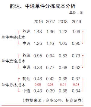 资产用在刀刃上,韵达是自动化分拣设备投资力度最大的快递企业之一,其对回报期较长的土地、房屋投入较少,但对短期能迅速降低成本的自动化投入较多。仅在2017年至2019年,韵达投资总额就超20亿元。这也助其单件分拣成本逐年下降,在高速增长阶段实现了成本最小化、盈利最大化。