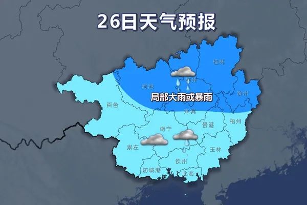 26日此次过程的主要降雨时段就是在这一天,全区大部都将转为阴雨天气,其中桂北地区部分地区或将有中雨,局部大雨或暴雨。
