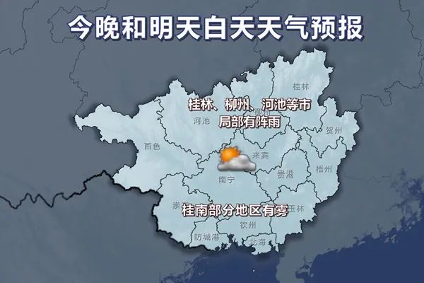 今天晚上和明天白天,全区多云,其中桂林、柳州、河池等市局部有阵雨。桂南部分地区有雾。