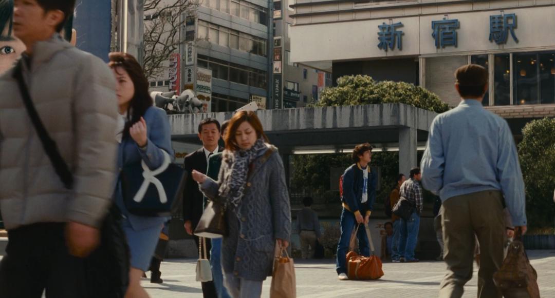 除此之外,《横道世之介》还设置了两个时空,一者是以世之介为视角的80年代,一者是世之介大学期间认识的友人们所处的当下。在电影中,前几个镜头便是对80年代的东京城市环境进行描写,然后才从城市的人群中“带出”世之介这个人物的登场。在长达几分钟的80年代东京城市描写,无论是城市景观还是人文都已经为整部影片铺垫了一个基底。初到东京的世之介,与络绎不绝的城市人表现得格格不入——他提着大包行李东张西望,看起来一点也不习惯这个环境。这便是吉田故事的影像化的一处表现:地方与东京的对照,地方的人对街上陌生人投以充满好奇心的视线。