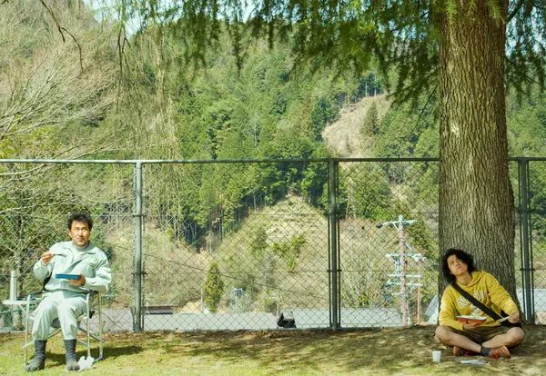 《去见瀑布》剧照在此,瀑布成为了电影中的一个终点,这个终点并不是有多脱离日常的东西,就仅仅只是一条瀑布,是司空见惯的日常的凝聚,是日常的代名词。而《去见瀑布》是最为朴素的冲田修一作品,从片名就已经提示了目的与终点,从第一句台词就把终点抬了出来,“去见瀑布”(滝を見にいく)这个片名本身就已经展示了一种朴素的姿态,因为瀑布随处可见,“去见瀑布”这个目的也并不构成一种奇迹。冲田修一电影的终点,永远都是将日常引领至日常,他不会让无常的奇观成为这些生活的终点。