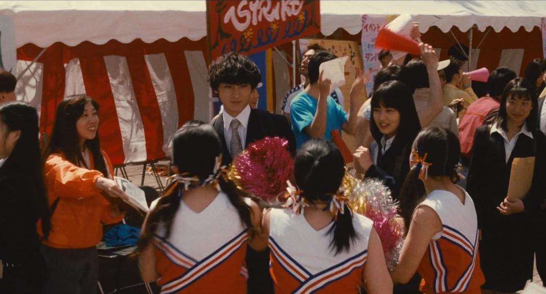 《横道世之介》剧照若此处与城市建立关系的瞬间还算是吉田的笔墨的话,那么笔者认为,冲田式建立关系的瞬间还在后头的一个情节:世之介先后认识了同届生的仓持和阿久津,世之介与阿久津相约逛社团招新学会,此时遇上的仓持惹哭了阿久津,桑巴社团的前辈“不识相”地围着这尴尬的三人欢歌载舞。这段情节也是本片配乐第一次出现的地方(从世之介和阿久津逛学会开始响起)。