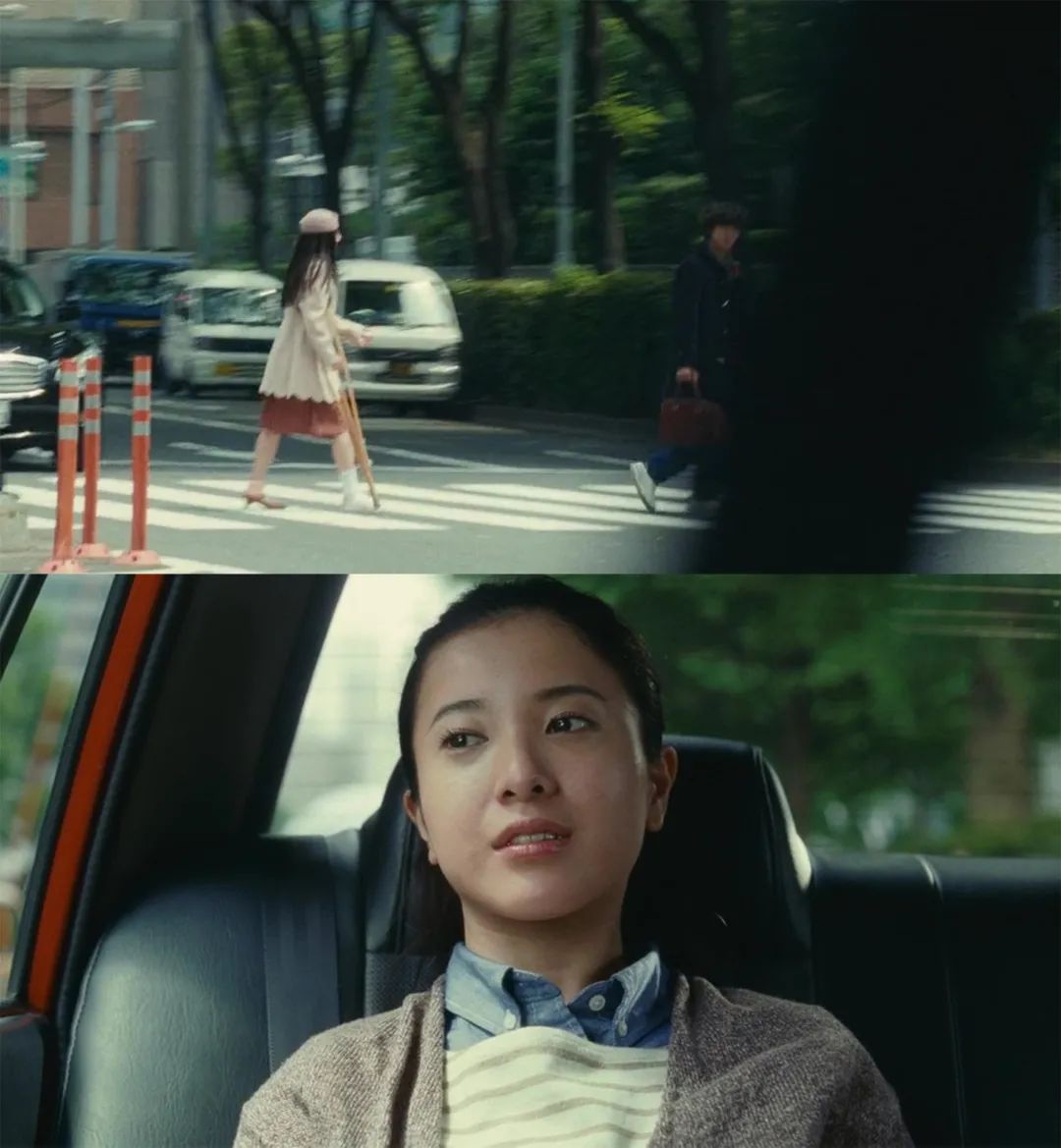 《横道世之介》剧照比如在影片前半,我们从千春的视角得知世之介的死讯的同时,也得知了他成为了摄影师,而摄影师的身份之谜则在影片后面才解开:八十年代的世之介认识了一位邻居,邻居带他进入了摄影的世界。又比如在影片中祥子对世之介重新评价为普通人之后,乘坐出租车的祥子在车中看到了当时与世之介走过的马路,回想起了和世之介在一起的时光。冲田修一在这一幕的处理是让两个时空置于一组镜头中,祥子似乎从车窗看见了马路上跟随着世之介的自己——此处对应的情节是学生时代的祥子因为腿部受伤刚出院,世之介却想要与祥子寻欢。