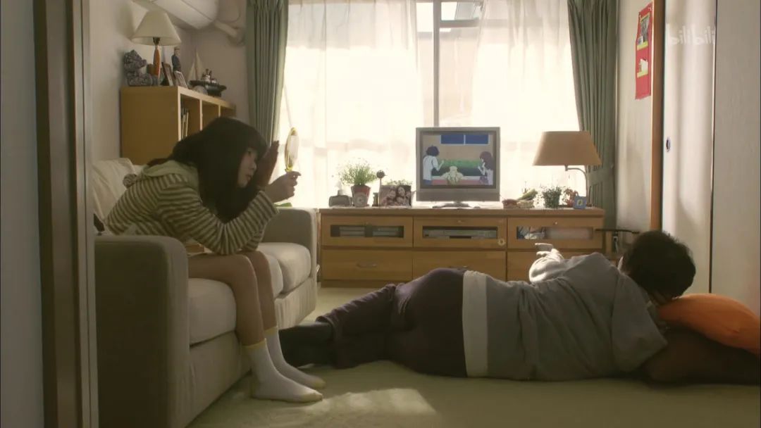 无独有偶,在《不让孩子知道》中,冲田修一在电影开场就安排了一个女主角在家看电视里播放的动画的固定机位镜头,而此时回到家的父亲(实际上是继父)见到女儿看着动画片跳起片中的舞来,他也上前跟着女儿一起跳(这一段是原作漫画中没有的情节)。这两部电影中,播放着成像的电视都联系着父女之间的关系,并通过镜头告知观众这些父女状态的变化。
