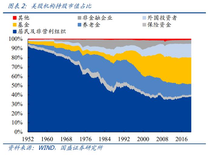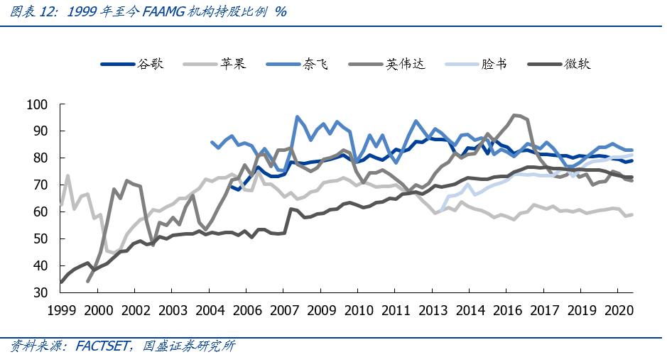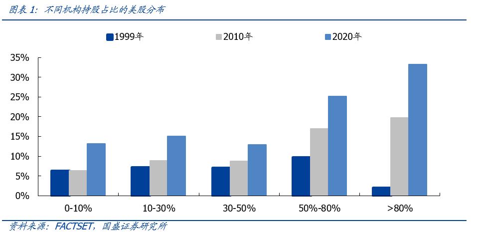 美股机构抱团是常态,机构话语权不断增强。随着美股机构发展壮大,机构持股占比在过去20年中大幅增长,当前机构持股市值占全市场流通市值的比重也已高达70%,成为美股市场的主导力量。截至2020年,机构持股比例在80%以上的个股占33%,这一比例在1999年仅为2%;持股比例位于50~80%之间的个股占比25%,这一比例在1999年仅为10%。