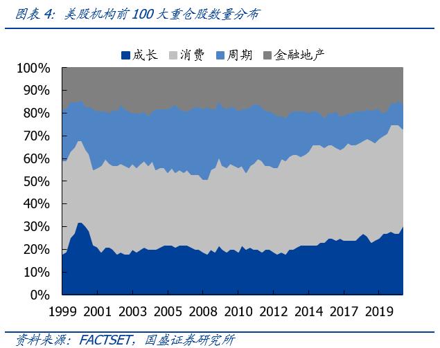 美股机构投资者抱团消费与成长。美股机构投资者前100大重仓股集中在消费与成长,消费与成长风格的机构重仓股数量占比与持股市值占比始终高于50%,是机构投资者主要的抱团方向。抱团风格在过去二十年中并非稳定不变,2000年至2007年,机构阶段性加仓金融地产和周期,但自2007年至今,机构则重新增配消费与科技,且个股数量与市值占比大幅上升,目前消费与成长的市值占比已超八成。