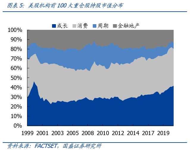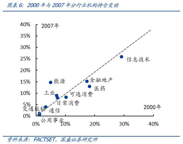 2、美股机构抱团也会阶段性向周期行业松动,但长期来看始终抱团消费与成长,尤其是2007年以来坚守信息技术与可选消费。