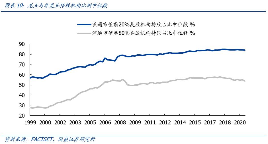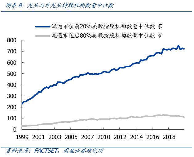 一是从持股机构数量来看,龙头的持股机构数量遥遥领先。以流通市值前20%的美股代表龙头,流通市值后80%代表非龙头,持有龙头的机构数量中位数由20年前的230家增长至700余家,而持有非龙头的机构数量中位数水平目前仍仅为100家左右。
