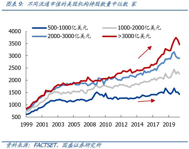 进一步按流通市值分组,龙头的机构持股数量占优。将美股按流通市值分组,流通市值大于3000亿美元、2000-3000亿美元、1000-2000亿美元与500-1000亿美元之间的持股机构数量差距在过去10年中不断扩大,市值越大,持股机构越集中,机构“以大为美”的选股偏好进一步强化。