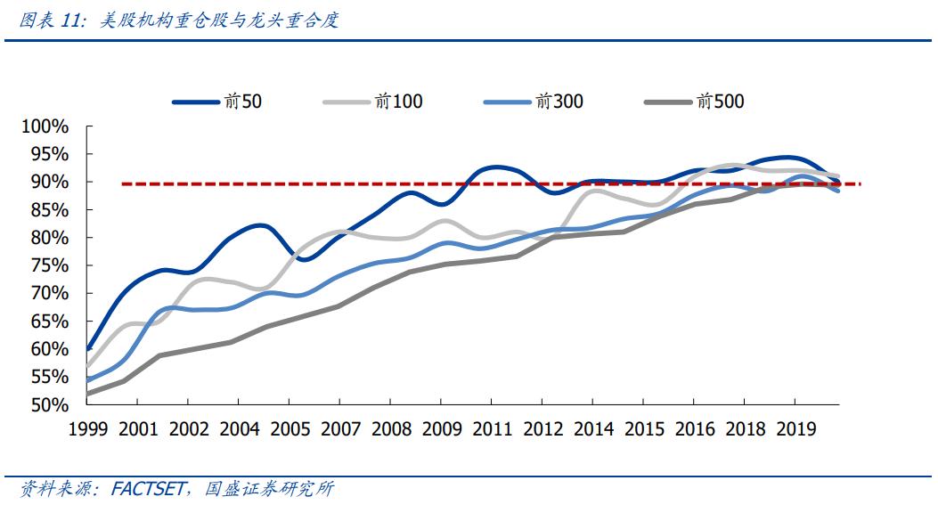 三是从机构重仓股与美股龙头重合度来看,重合度不断提升意味着机构持续向龙头集中。机构持股市值前50、前100、前300与前500对全市场流通市值前50、前100、前300与前500的覆盖度近年来已基本维持在90%以上,而2000年前后这个比例仅有50%~60%,这说明美股绝大多数龙头已经纳入机构麾下。