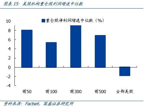 3、抱团高ROE从重仓股看美股机构的选股偏好,相比于利润增速,美股机构更注重ROE。美股机构重仓股的ROE水平普遍较高,前50大重仓股的ROE高达26.1%,前100、前300、前500的ROE逐渐降低,但仍显著高于全部美股的ROE水平;而机构对于重仓股利润增速的偏好相对较低,利润增速中位数并非有序回落,机构更加注重长期增长的确定性。