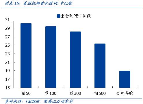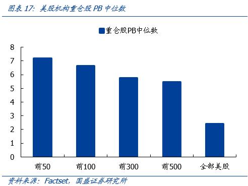 相应地,美股高ROE重仓股享有估值溢价。从PE角度。美股机构前50大重仓股的PE中位数为30.0,明显高于全部美股的18.9,且随着持仓仓位的下降,PE估值也有序下降;PB角度亦是如此,前50大重仓股PB中位数为7.2,高于全部美股的2.40。