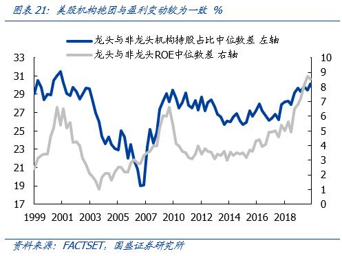 机构投资者长期抱团美股龙头实际上也是对盈利确定性和稳定性的持续追求。中长期来看,美股机构化带来定价体系由估值主导向盈利主导变迁,机构投资者对龙头与非龙头的持股行为也呈现出较为明显的ROE驱动的特征,美股龙头与非龙头机构持股占比的分化水平与二者ROE分化水平之间的变动较为一致。