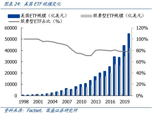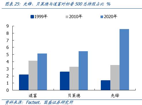 除机构对确定性的追求外,近十年美国被动型基金大发展,也进一步强化了机构抱团龙头的效果。美国ETF规模由1998年的不足200亿增长至2020年的5.4万亿美元,股票型ETF的规模达4.2万亿美元,占比近八成。以美国ETF三巨头——先锋、贝莱德、道富为例,三家在标普500成分股的总持股占比由1999年的5.9%上升至2020年的19.1%,机构资金持续向优质龙头集中。