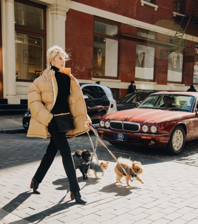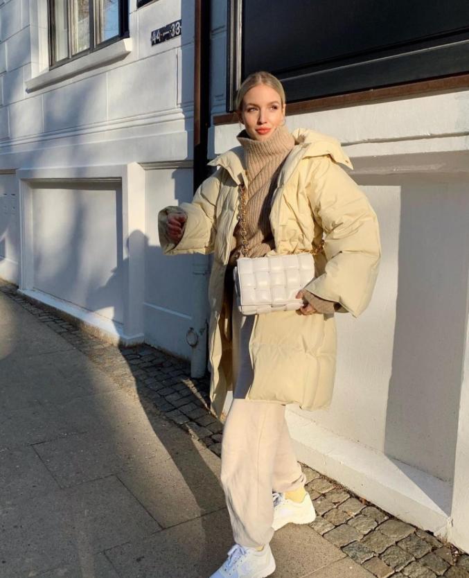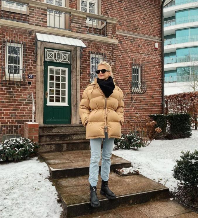 时尚博主Caroline Daur除了搭配做差异,还可以从单品本身下手。与拉开拉链搭配全黑造型不同,Caroline Daur 在穿同一件裸色羽绒服的时候还会将拉链拉起来,搭配黑色围巾、浅色系牛仔裤,让造型更保暖的同时不至于沉闷。收紧腰线的方式也让造型更突出曲线感。
