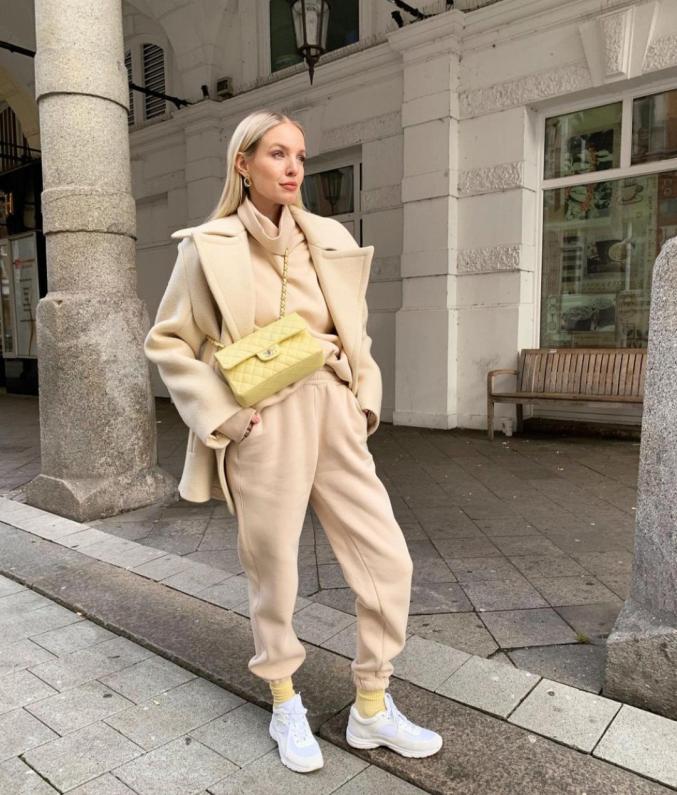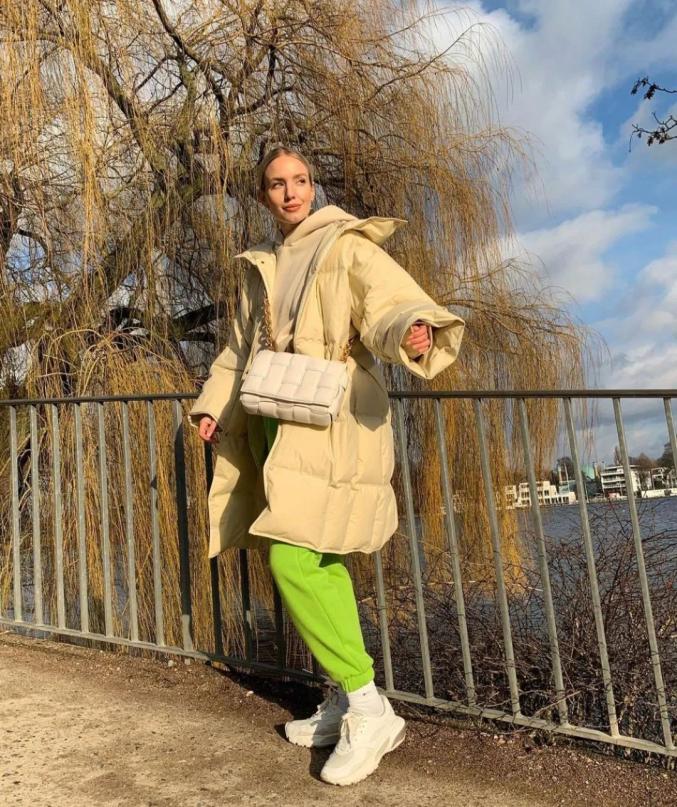 时尚博主Caroline Daur德国时尚博主Leonie Hanne 也采用了这样的穿搭方式。连帽卫衣搭配荧光黄色运动裤,宅家舒适套装外再穿上裸色羽绒服,居家与外出场景一秒切换,轻松又保暖。