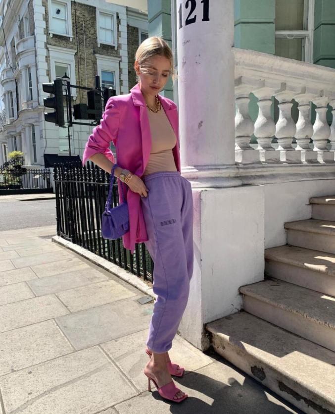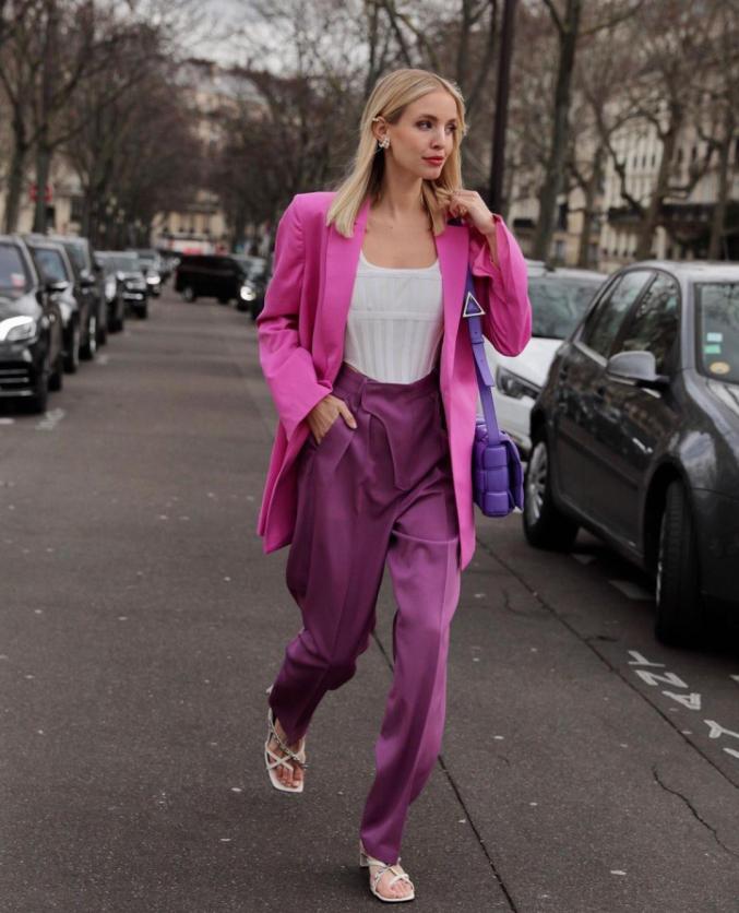 Leonie Hanne 有一段时间钟爱撞色系搭配,荧光粉通过撞色搭配,明艳动人。Leonie Hanne 还通过换发型、包包来让造型具备差异化,一件西装外套仿佛拥有了不同的生命。