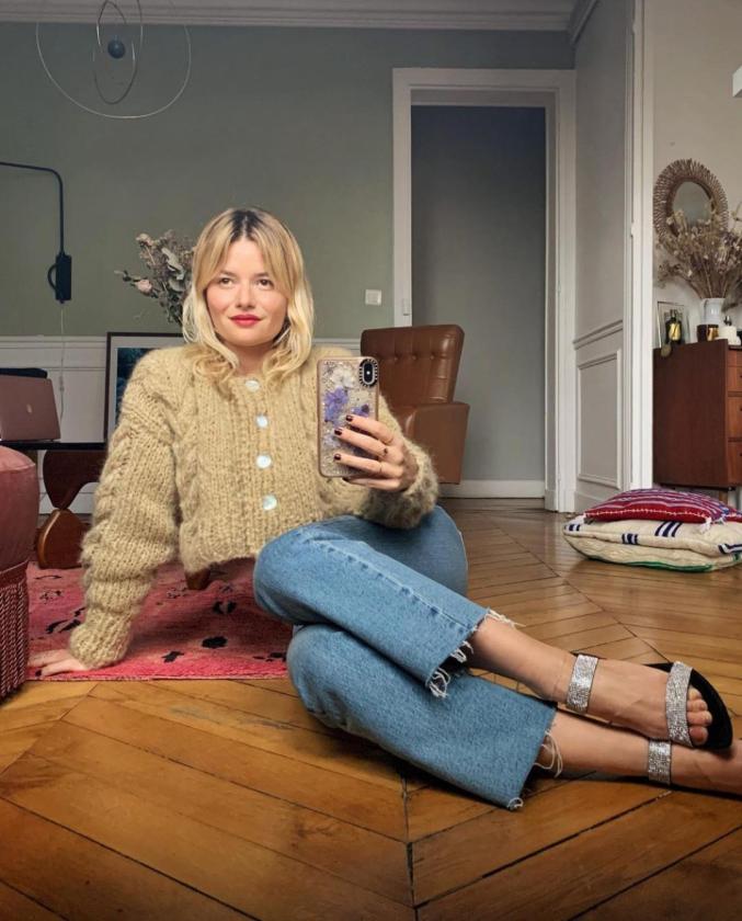 时尚博主Leonie Hanne时尚博主Sabina Socol 最近特别钟爱短款针织开衫,一件驼色短款开衫就让她穿出了花儿。扣子整整齐齐的扣起来,再搭配高腰牛仔裤,看似严肃但一动就会露出腰腹部的肌肤,妩媚又有一丢丢俏皮的感觉。