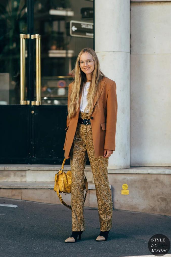 焦糖色西装外套内搭白色打底衫,重点突出在蟒蛇花纹的皮裤上,潮范儿十足;搭配同色系格纹丝巾,乖巧可爱,对我等普通人来说借鉴难度也不高,日常就可以模仿。