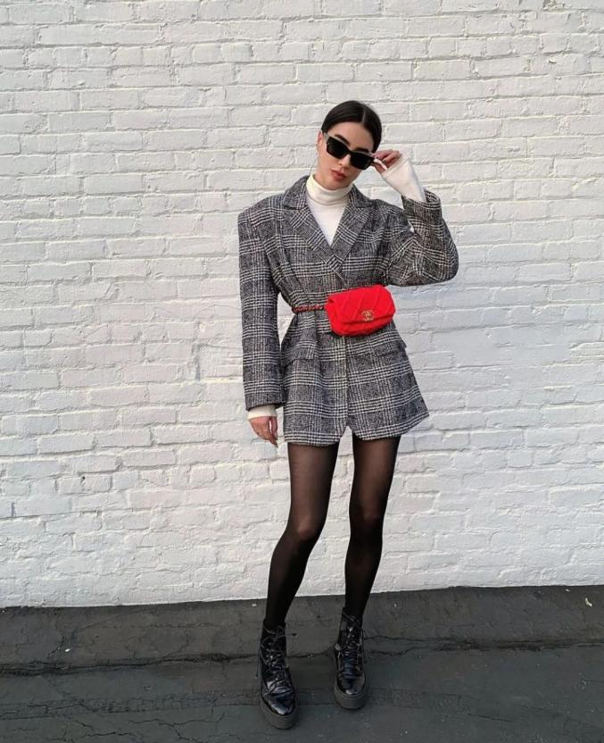 常见的灰色格纹西装,把腰包系在外套内,露出一段腰部肌肤,帅气性感还有一丝小随性;腰包系在外套外勾勒出腰线、搭配黑色丝袜,打造下衣失踪风,造型更添妩媚。