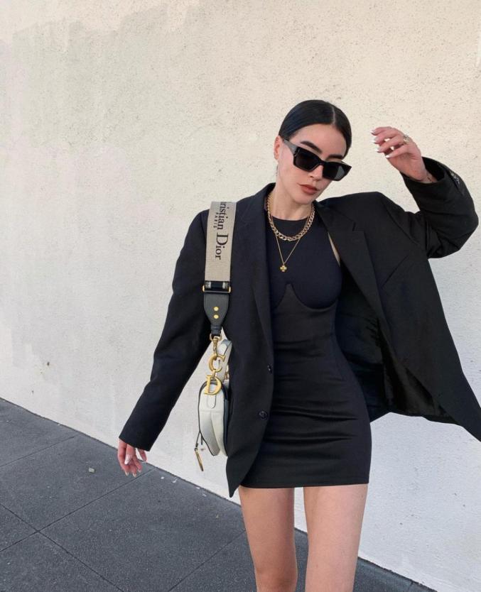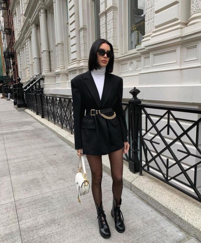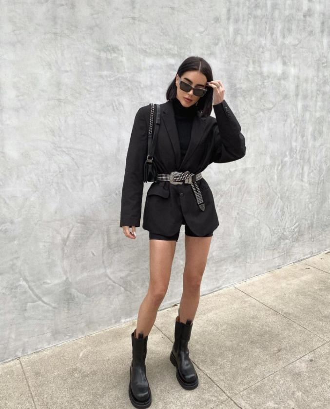 时尚博主Brittany Xavier最平常的黑色西装外套打造的All black造型,通过增加腰带打造的造型,与不加腰带相比较,不能说不像,简直是毫无关系。