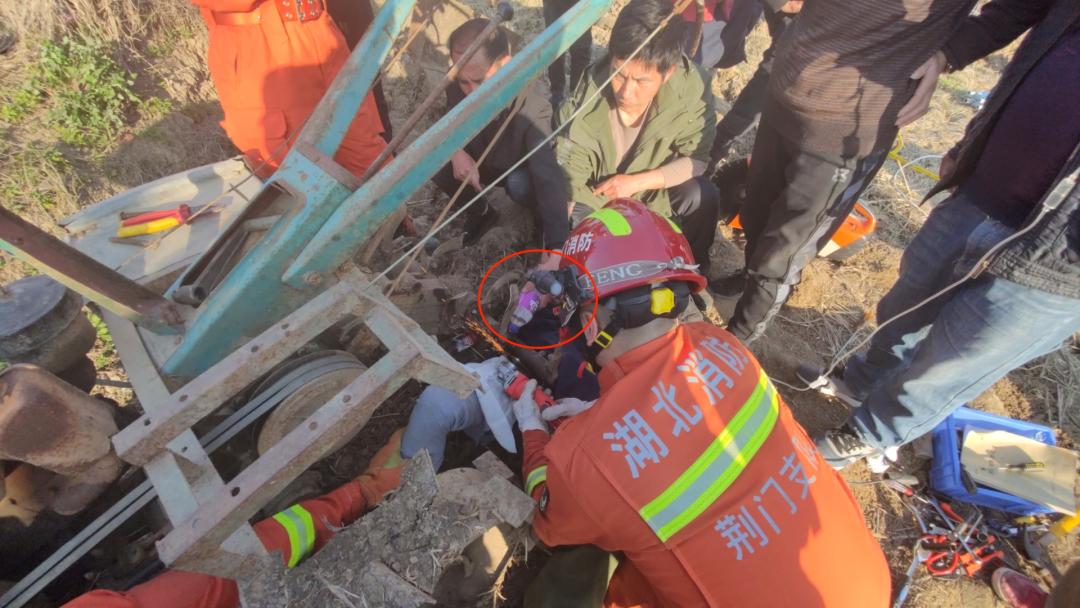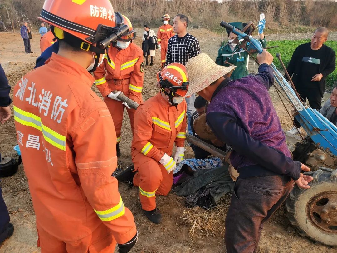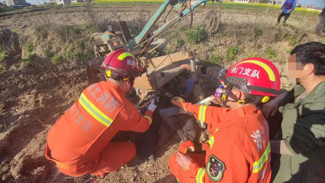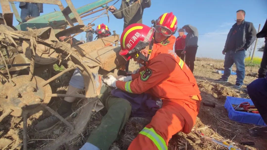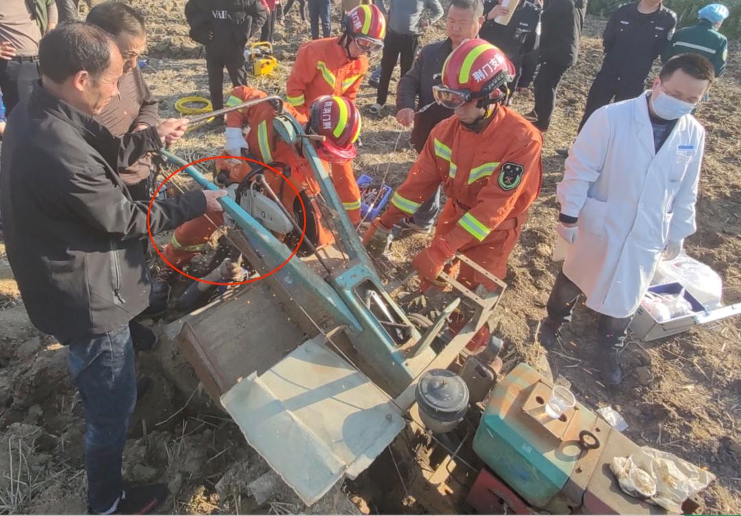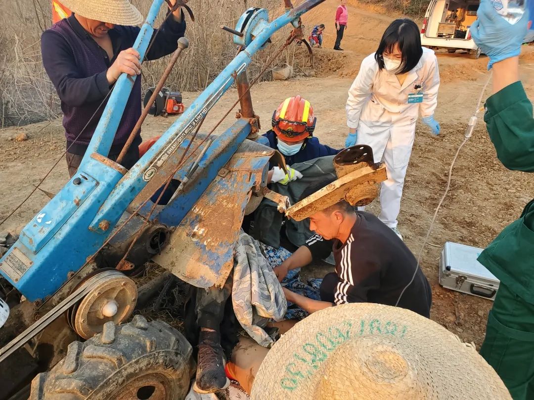 受伤男子腿部被旋耕机叶片牢牢卡住医护人员正在一旁采取紧急处置措施
