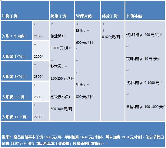 转正后底薪:1630元+全勤60元+交通补贴(未住宿坐厂车)40元/月+绩效200元+岗位津贴100元;