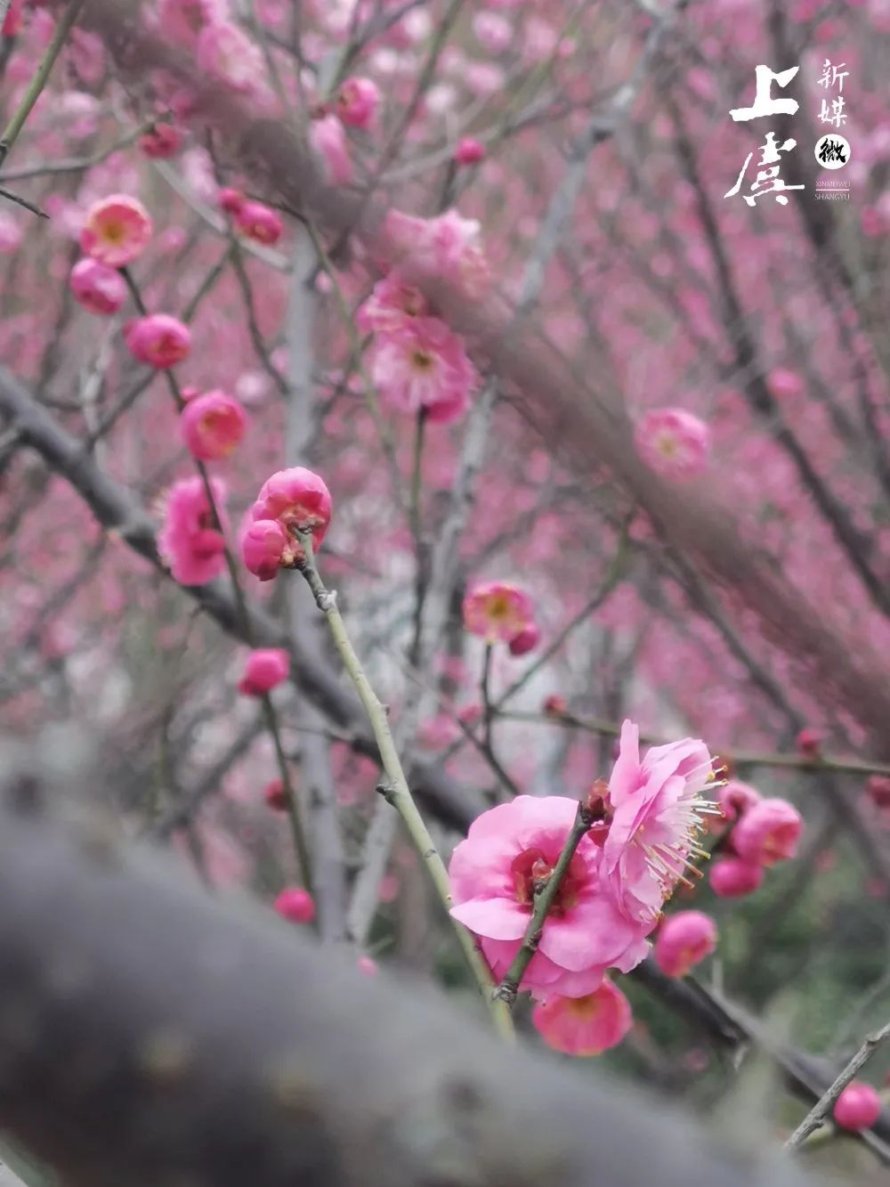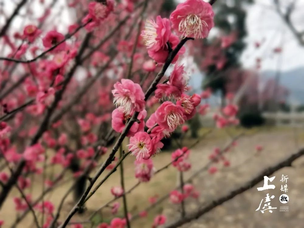 初春时节,剡湖街道碑山、罗南等村梅园里的梅花含笑怒放,千亩梅园里入目皆是或红或白的盛开梅花。