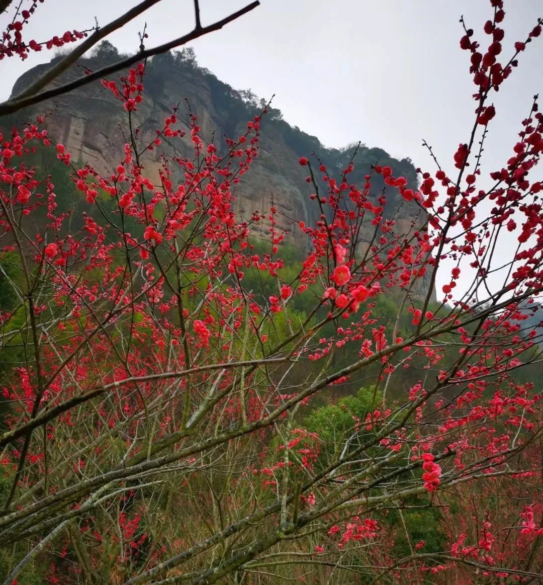 春意盎然,在穿岩十九峰内,红梅在春风里绚丽绽放。零星分布的梅花树,为这个春天点缀着第一抹红,也柔和了山峦之间的春天,增添着这里的诗意。