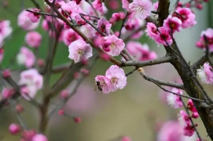 梅花盛放 来源/贵州改革楠竹林公园的梅花如期开放,渐变粉的花瓣层层叠叠,引来了“嗡嗡嗡”的蜜蜂。