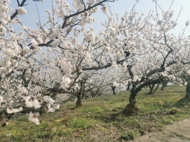 千果园樱桃花绽放每年2月至3月,千果园内樱桃花、李花、桃花迎春绽放,远远望去,成片的樱桃花白如雪,美不胜收。