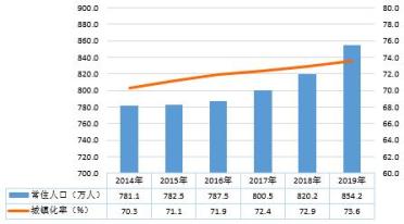 2014-2019年宁波市常住人口及城镇化率。根据《2019年宁波市国民经济和社会发展统计公报》,2019年末,宁波全市拥有户籍人口608.5万人,其中市区300.9万人。全年出生49464人,其中男性25772人,男女性别比为109︰100。人口出生率为8.17‰,自然增长率为2.14‰,连续22年低于5‰。年末全市常住人口为854.2万人,城镇人口占总人口的比重(即城镇化率)为73.6%。