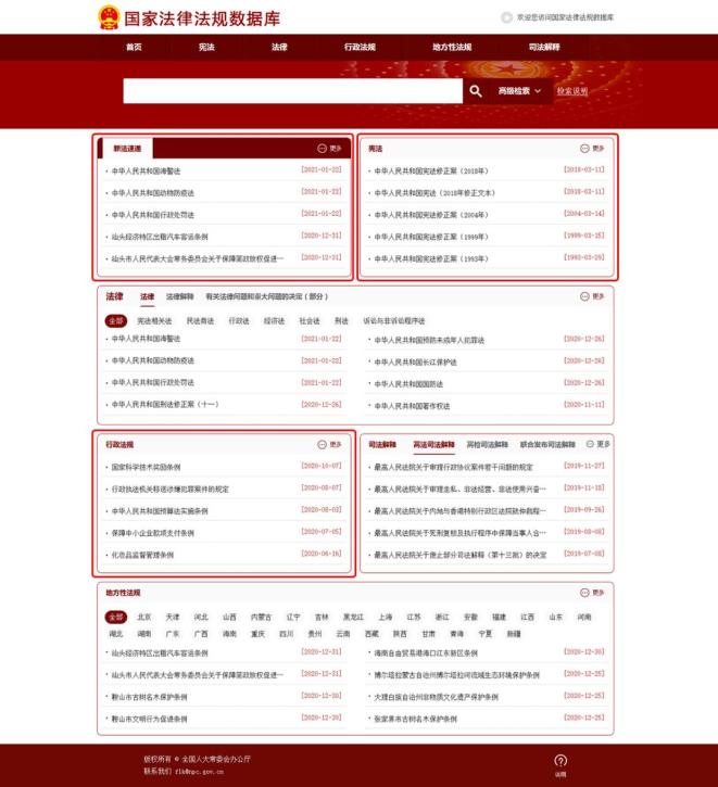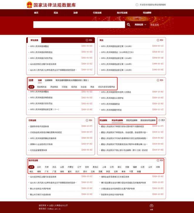 国家法律法规数据库由全国人大建立并维护,目前登载中华人民共和国的宪法、法律、行政法规、地方性法规以及司法解释。(网站首页参考图1.1)