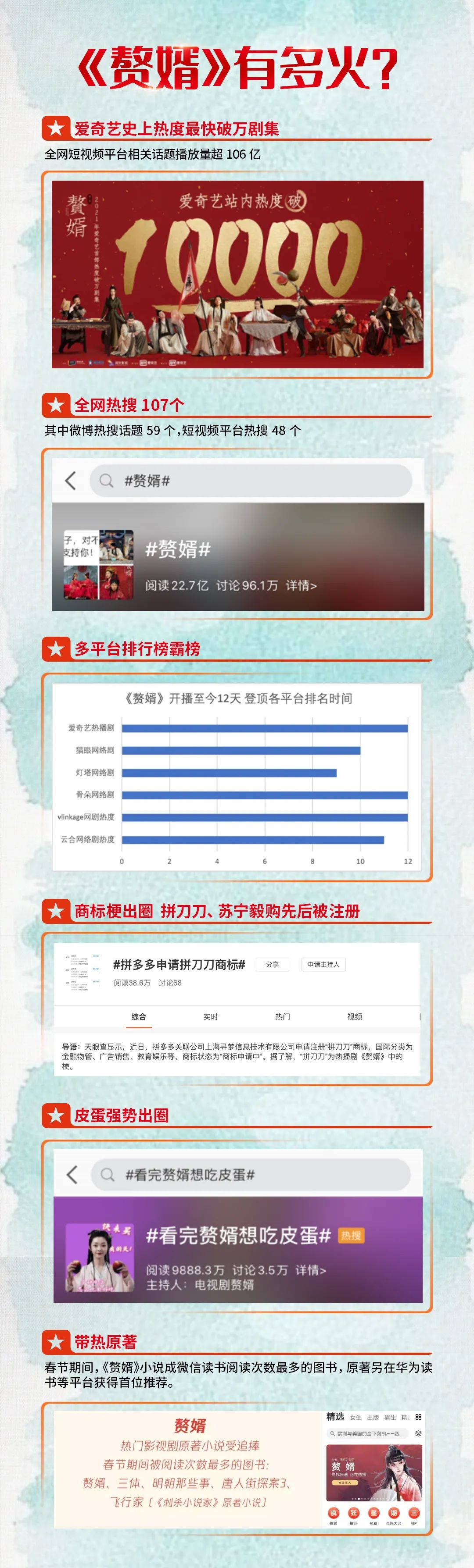 据2021微信春节数据报告显示,春节期间,《赘婿》原著小说成为微信读书阅读次数最多的图书,其次是《三体》《明朝那些事》《唐人街探案3》《飞行家》(《刺杀小说家》原著小说),剧粉与原著粉流动循环,双向反哺,成为了剧集热度发酵和原著影响力再破圈的推手之一。