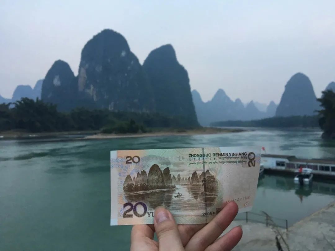 20元人民币上的倒影正是阳朔兴坪古镇的山水画廊