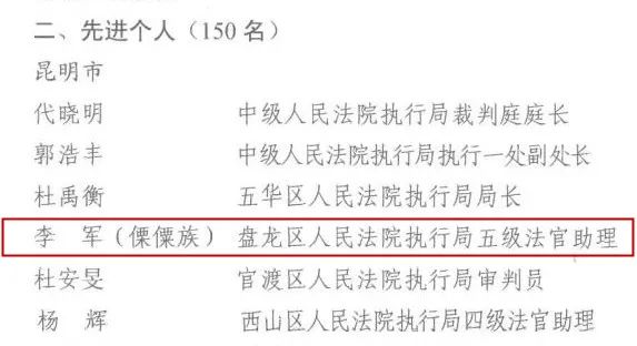 近日,云南省高级人民法院发布了《关于对全省法院2020年度执行工作先进集体、先进个人予以表扬的通报》,对2020年以来执行工作中成绩突出的集体和个人予以通报表扬。其中,昆明市盘龙区人民法院执行局李军被表彰为“全省法院执行工作先进个人”。