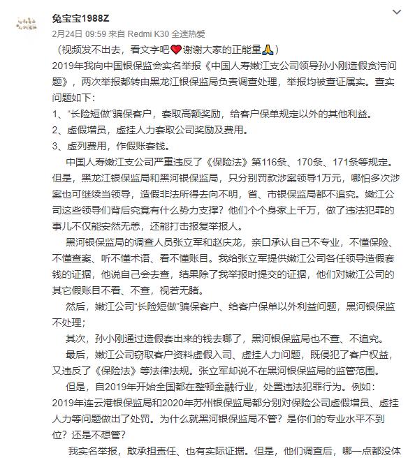 张乃丹在微博上表示,她从2019年开始向相关部门举报该支公司领导孙小刚。彼时,其发布文章《中国人寿黑河、嫩江公司的黑幕》并@中国人寿、中央纪检监察委等机构和媒体官微。