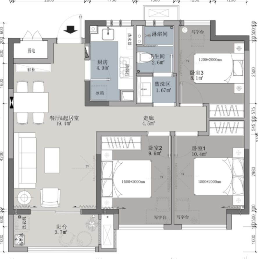 三居室A户型32套(91.42㎡/套)三居室B户型32套(92.57㎡/套)