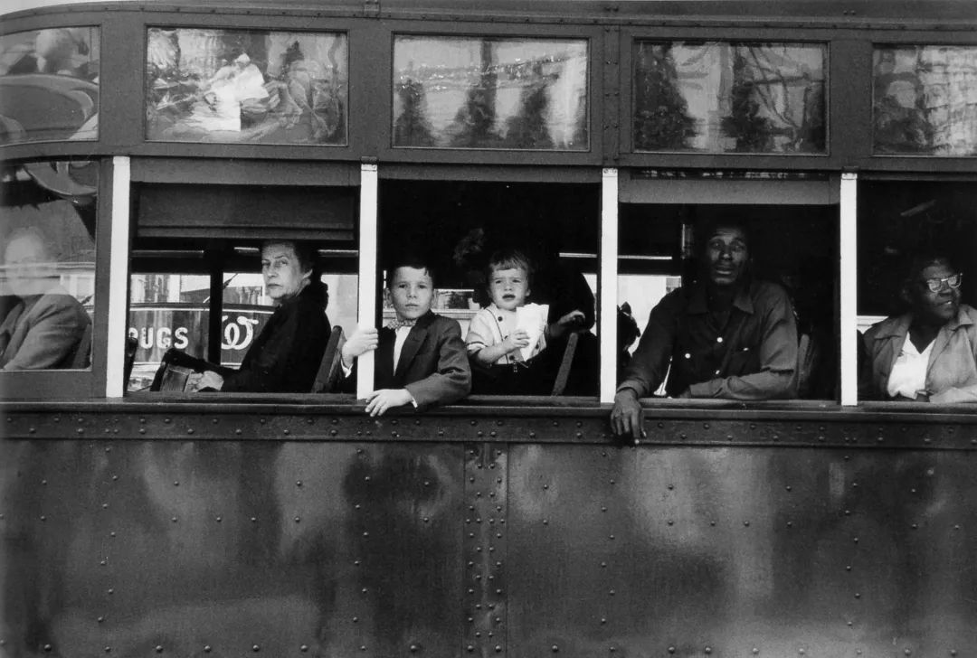 《美国人》一书的情感基调和拍摄手法都与埃文斯的作品大相径庭,但他们拍摄的肖像作品却十分相似:都以巧妙的反讽方式表现美国本土符号。弗兰克的作品以一种外来者的视角进行拍摄,这很容易让人联想到埃文斯作品中冷冰冰的疏离感。模糊的画面、失衡的构图以及一些无法预料的意外都被记录下来,这些都象征着战后几近破裂的生活。因此,这些来自20世纪50年代的美国片断看上去似乎是错乱、失常的。弗兰克提出了一个问题:如何描绘现代生活的平庸(前提是既不屈服于它,也不试图消解它)。如今,这一问题已成为当代摄影中的核心议题,但弗兰克并未给出答复,而是将问题留给了其他人。
