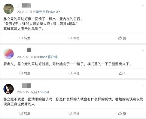 温和一些的批评也有:我不觉得易立竞的采访有多好,从某种角度来看她并没有尊重被采访者,她只想看人出丑,拉几个臭名昭著的名人为自己添彩。