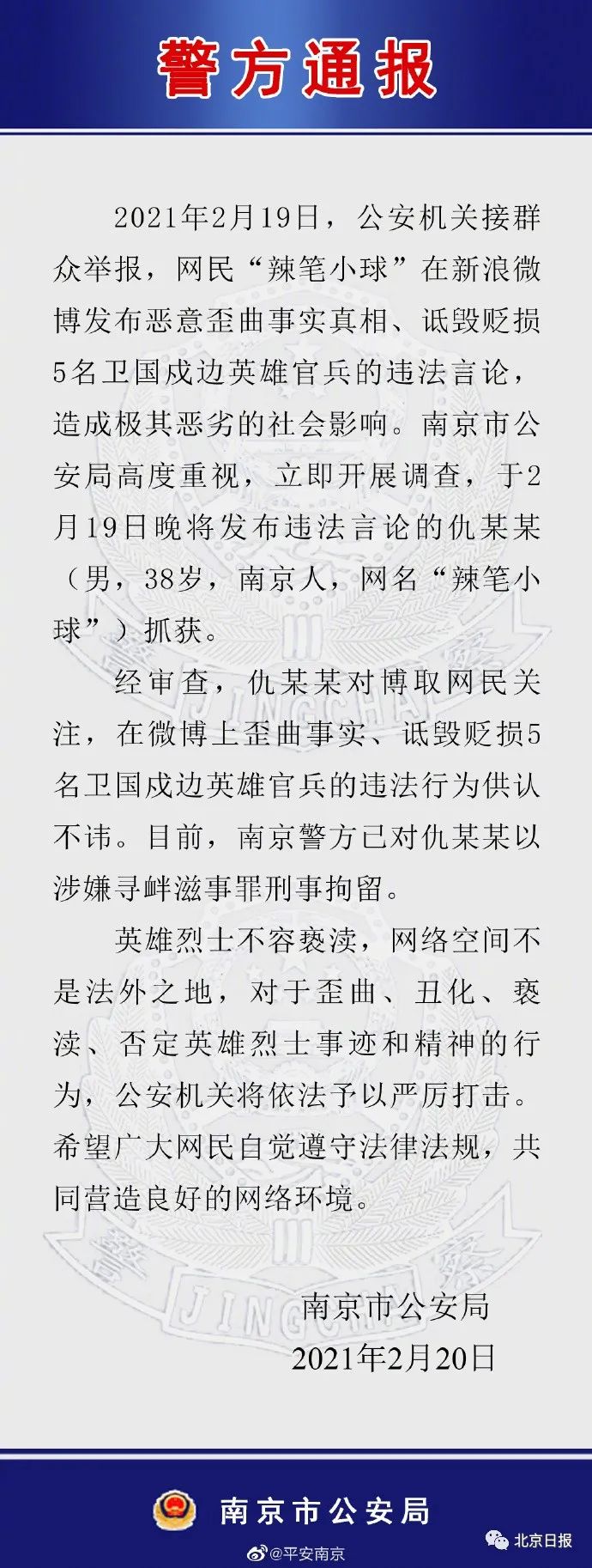 2月20日,@平安南京 发布通报:2021年2月19日,公安机关接群众举报,网民“辣笔小球”在新浪微博发布恶意歪曲事实真相、诋毁贬损5名卫国戍边英雄官兵的违法言论,造成极其恶劣的社会影响。