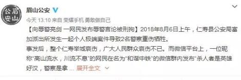 2018年8月6日上午,仁寿县公安局富加派出所发生一起个人极端案件导致2名警察重伤牺牲。事发后,整个仁寿举城哀伤。而微信平台上,一位昵称“高山流水,川流不息”的网民在名为“和谐中铁”的微信群内发布“杀人者是英雄好汉,警察是拿了证的土匪”等辱警言论,其发布的辱警言论涉及广泛,造成的影响极其恶劣,被以寻衅滋事罪刑拘。当然这绝对不是第一次,此前有沈阳民警牺牲,有两人因发辱警言论以寻衅滋事罪被刑事拘留。据悉,全国因辱警有多人被以寻衅滋事罪被刑拘,因寻衅滋事被处以被行政拘留治安处罚的就更不计其数。网上辱骂警察要不得,侮辱牺牲民警更是“零容忍”,言论自由但不能仍性,要有敬畏之心。