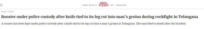 综合《今日印度》、法新社等外媒27日报道,印度南部特伦甘纳邦日前发生一起离奇命案:一名男子带着他的公鸡去参加非法斗鸡比赛,然而自己却意外身亡,而“凶手”正是他带的公鸡。