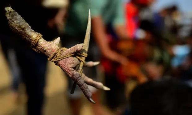 据《卫报》介绍,在印度特伦甘纳邦等地的农村地区,斗鸡是被禁止的,但这一情况仍然很常见。经过特殊培育的公鸡爪上绑着约7.5厘米的刀或刀片,赌客们打赌谁会赢得这场可怕的战斗。据介绍,每年都有数以千计的公鸡在斗鸡中丧生,尽管动物权利组织做出了努力,但这种比赛还是吸引了大量人群。
