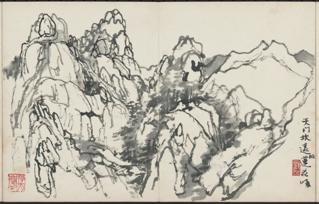 对于现代人来说,写生是艺术教育的一门基础性课程,但是往前推100年,写生却是一个舶来语,它来源于1912年刘海粟等人共同创办的上海美术篆刻学校,把它变成了课程,成为一个体系延续到今天。对于艺术界来讲,引入写生是一个非常直观的方法,可以观察自然、采集信息、更深刻地体悟美。展览的缘起是一本画册——《黄山纪游》,是1979年上海人民美术出版社为刘海粟先生出版的第一本画册,也是改革开放初期中国艺术家出的第一本画册,记录下了海老对黄山最初的艺术印象。这些写生稿对于海粟先生来讲,都是在收集他对看到事物的感悟,在创作过程中这些感悟他还会对其进行艺术的转化。比如《桃花溪》这件作品,我们在册页上可以很明确地看到它在现场带给画家的即时面貌,但在这件作品的转化过程中,不仅有海老对中国画的感悟,还有非常明确的篆书的笔法。他将来自于自然、来自于古人的感悟全部融会贯通,他的表达可以是中西融合的,但是都是他自己的。