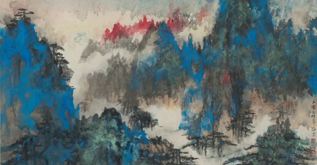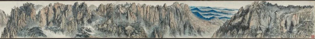 比如这件《黄山西海门图卷》,是刘海粟先生在上世纪五十年代描绘的黄山写生作品,虽然很长,但它大部分的笔法或者呈现方式,都还是中国传统宋元山水画的表达,但是特别有意思的地方,海粟先生在中间画了一块非常艳丽的蓝色,用这块颜色来呈现自己当时看到的黄山的烟霞,这就是中西融合一个非常好的表达方式,这里面完全没有门户之见和中西之分,完全就是海老创新精神的一种呈现。