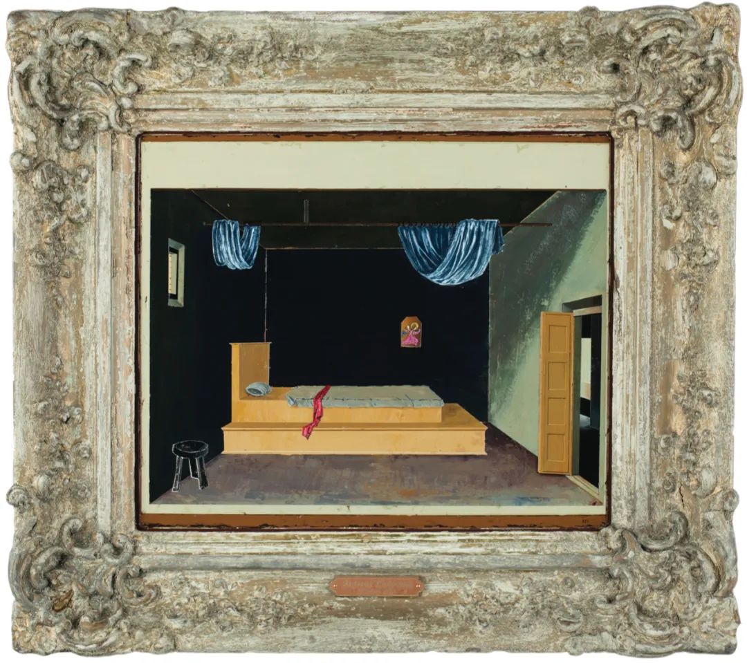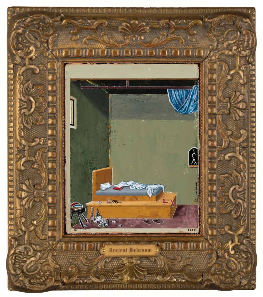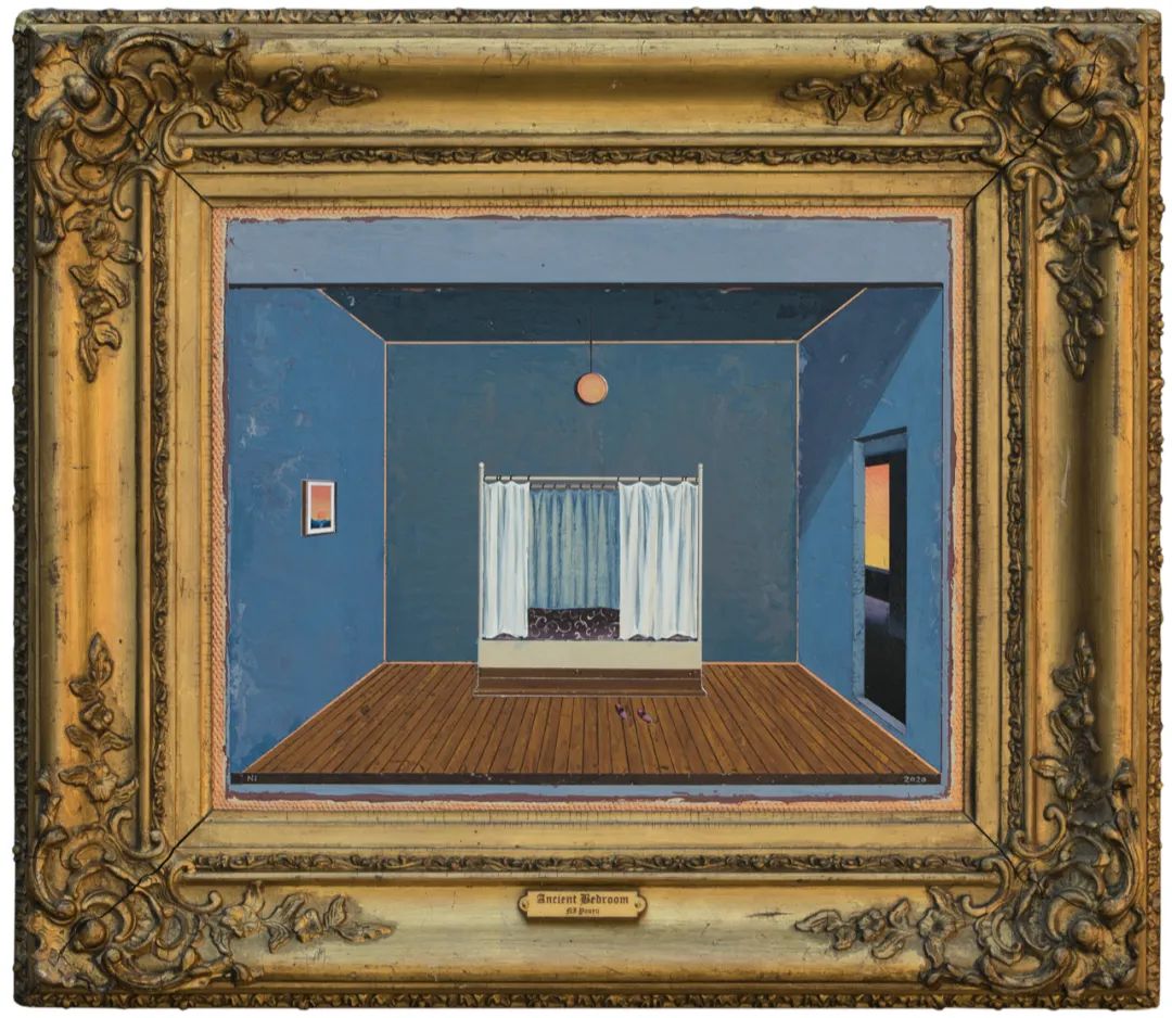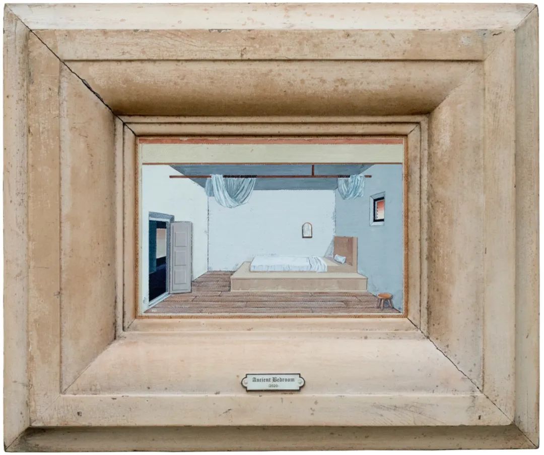 新系列的绘画,是在一批古董画框里描绘无人的空房间。画的内容十分应景:卧室、餐厅、床、工作室……各种各样的室内空间,是过去一年疫情里,全球人民待的最多的地方。